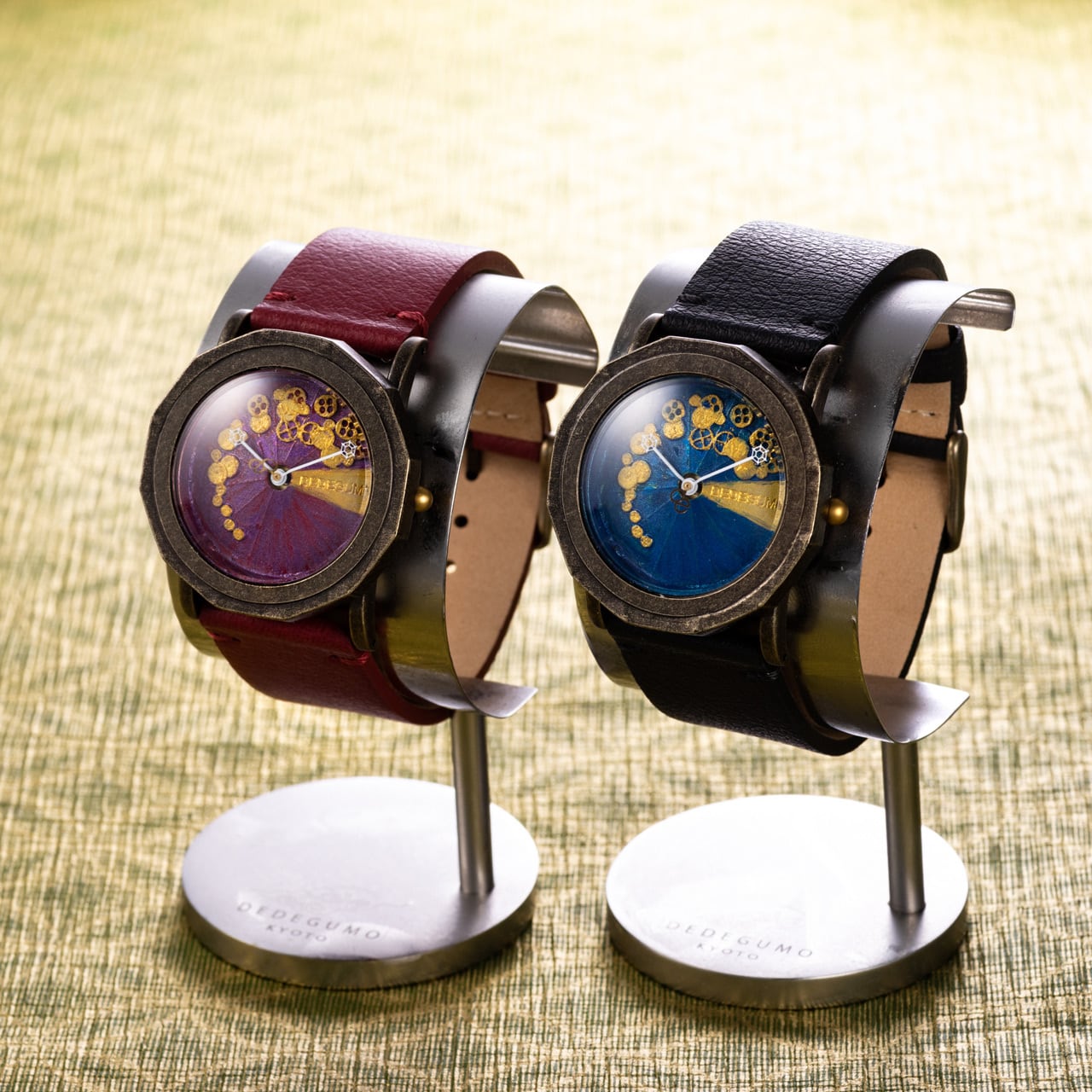時計は京都の工房で手仕上げしています。そのため文字盤着色等ひとつずつ若干仕上がりの風合いが画像と異なる場合がございますので予めご了承下さい。