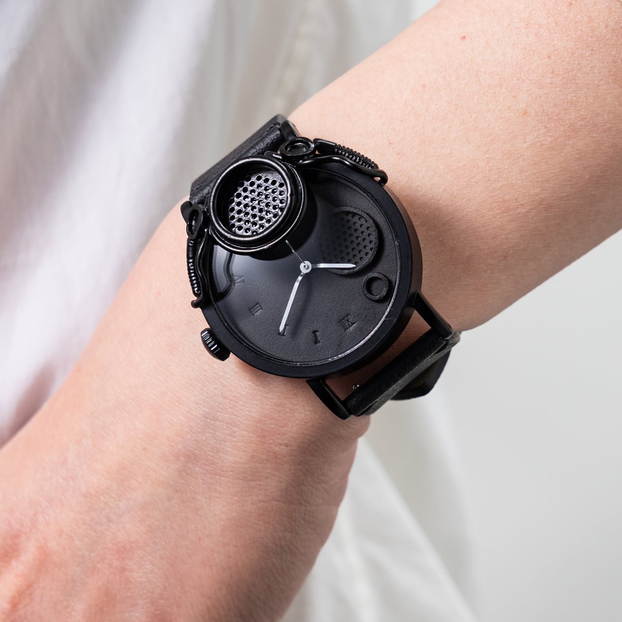 (Shichigoroさんコメント)裏路地の配管、道に捨てられたガスマスク、ゆっくりと朽ちる機械の世界で新たな生命と時間が動き出す...といったイメージです。時計のガラスケースの外と中を使って立体的に、なるべく装飾的にせずにシンプルながらも重厚な金属感と存在感を感じられるよう意識してデザインしました。インダストリアルパンクな世界をちょっと感じていただけたら嬉しいです。web site : http://shichigoro.com/