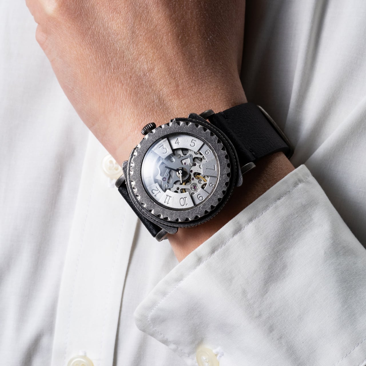 モチーフやテーマでデザインを縛らず手作り時計特有のかっこよさ(手作り時計の王道)を真鍮=黄銅という素材で追求したい、ということをコンセプトに制作しているシリーズです。「ビジネススーツにも似合うDEDEGUMOを」というコンセプトで作りました。